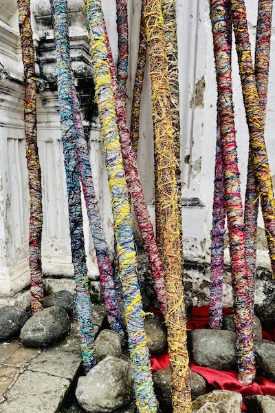 Su obra, titulada Peregrinación, se eleva desde el suelo en forma de grandes postes envueltos en fibras y textiles de colores intensos. Se apoyan sobre la torre campanario de la iglesia como si hubieran sido dejados allí por viajeros que llegan después de un largo recorrido. Hicks imaginó cada poste como un bastón cargado por un peregrino que hace una pausa en Santa Ana para descansar, rezar o simplemente respirar antes de continuar el camino. La instalación invita a los visitantes a situarse en ese mismo espacio de pausa y reflexión, a percibir la presencia de quienes estuvieron antes y a sentir la fuerza serena que envuelve a la iglesia.